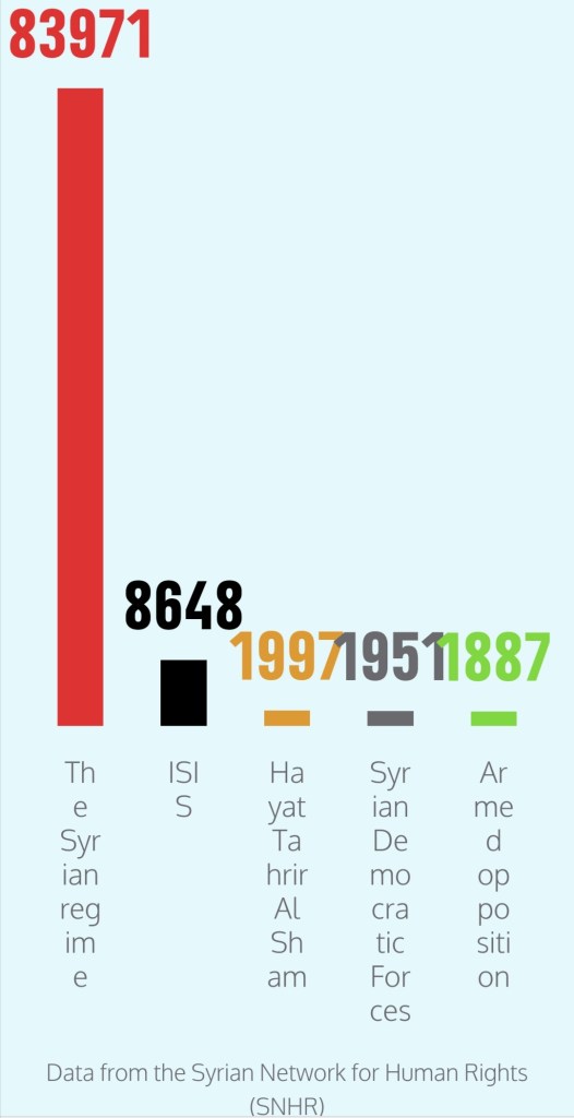 Il regime è responsabile di circa 83.000 dei casi, l’ISIS e gli altri gruppi jihadisti di 10.000, le Syrian Democratic Forces di 1.800 cosi come i vari gruppi dell’opposizione armata. Oltre a torture, detenzione arbitraria , omicidi extragiudiziari, sparizioni forzate, stupri, abbiamo la violazione della proprietà delle vittime, estorsione dei familiari degli scomparsi, giudizi sommari e tante altre violazioni; questo il trattamento riservato dal regime siriano ai suoi oppositori. Ad emulare queste pratiche, Daesh ed i vari gruppi jihadisti. I familiari dei detenuti non hanno alcun tipo di informazione riguardo ai propri cari nelle carceri del regime o vittime di sparizione forzata. Nel 2017 lo stato inviò ad alcune famiglie certificati di morte dei propri familiari, deceduti anni prima in prigione, senza indicare il motivo del decesso, e soprattutto senza restituire i corpi dei detenuti.(Combattendo per poter avere delle tombe da visitare) Ci sono persone scomparse da 10 anni delle quali nessuno sa nulla. Nel 2014 un uomo che lavorava al servizio del regime fotografando i cadaveri dei detenuti , disertò e riuscì a portare con sè in Europa circa 28.000 foto di cadaveri. Dalle foto di Caesar (questo il nome in codice dell’ex funzionario del regime) molti riconobbero i volti emaciati e sfigurati dei propri familiari (accanto ad ogni corpo vi erano tre numeri: uno assegnato al detenuto dal centro di detenzione, quello dello stesso centro di detenzione e il numero assegnato dal medico dell’ospedale militare)