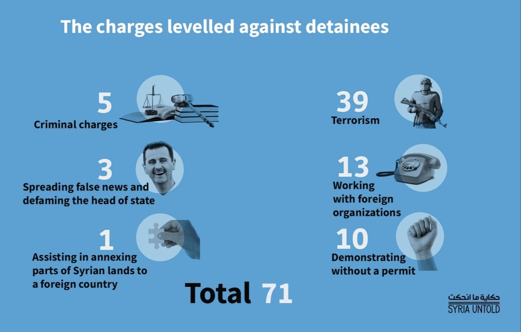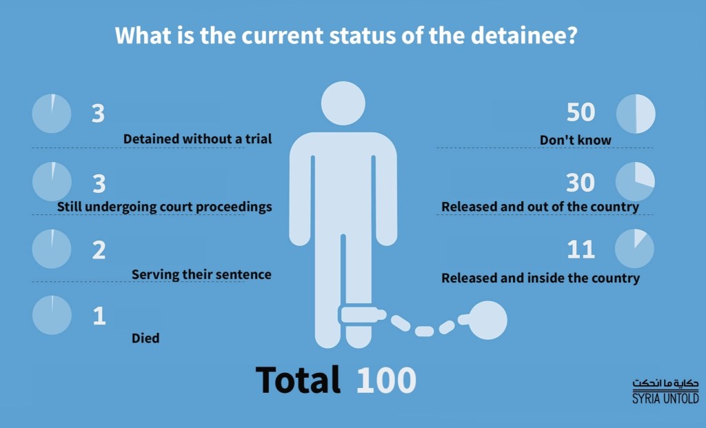 Dei 100 casi esaminati, il governo ne ha rilasciati 41, compresi quelli che sono stati rilasciati su cauzione e quelli che hanno scontato un pò di tempo in prigione. In nessun caso il detenuta è stato ritenuto innocente. Tre quarti delle persone rilasciate hanno detto a SyriaUntold di aver lasciato la Siria portando ferite fisiche e psicologiche dal loro periodo in prigione. Restano altri 50 casi le cui famiglie non sanno nulla della sorte dei loro parenti detenuti.
