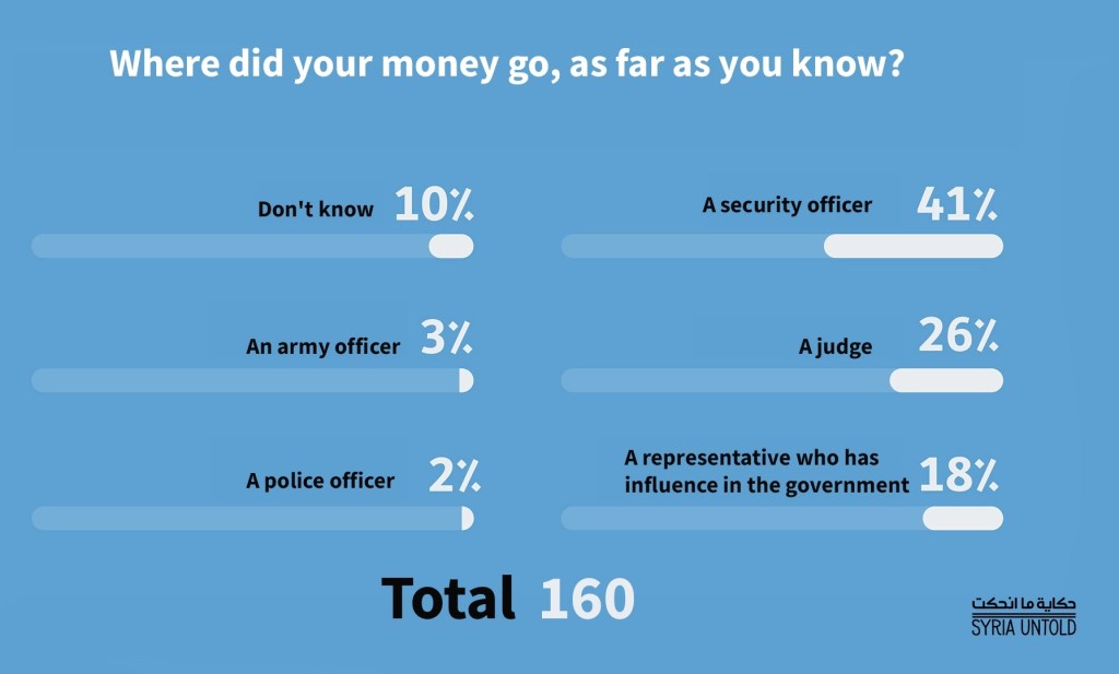 La ripartizione dei pagamenti aiuta a far luce su quanto sia profondamente radicata questa economia carceraria in tutti i settori della Siria. Tuttavia, le realtà sul campo potrebbero essere ancora più complesse di quanto rivelano i numeri. A volte la mediazione avviene attraverso reti personali e le famiglie iniziano a cercare parenti e conoscenti che hanno rapporti con i funzionari del sistema.