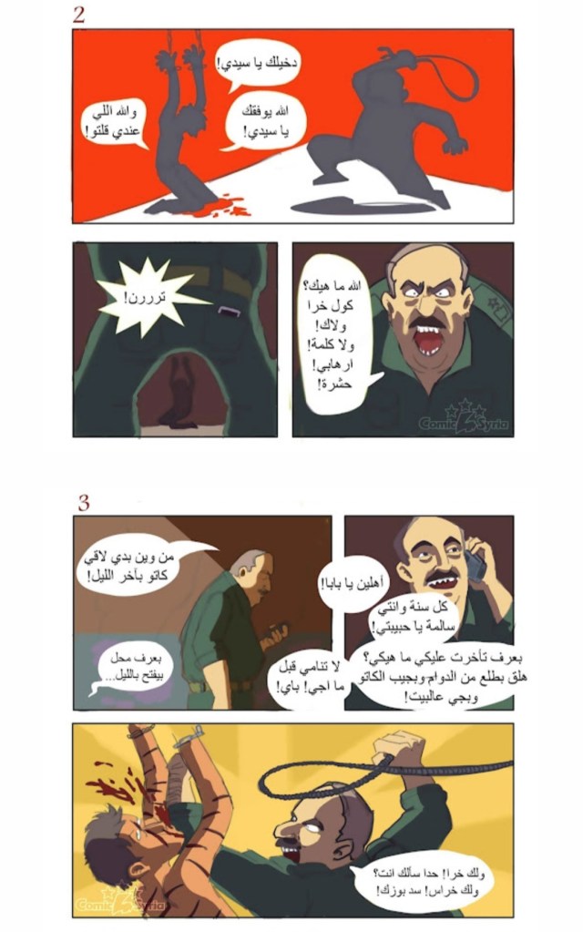 In questo clima, i fumetti creati e pubblicati da Comic4 Syria e altri sono esplosi con urgenza. Hanno rappresentato l’euforia delle proteste di strada, la brutalità nelle carceri siriane e tutto il resto. Forse erano un tentativo di compilare il fugace “ora” e “qui” sullo sfondo di una serie di eventi sempre pressanti e in competizione. E anche se Comic4 Syria ha smesso di pubblicare nel 2016, i suoi fumetti servono ancora a narrare o documentare un certo momento della storia della rivoluzione siriana. Sono un archivio per il futuro.