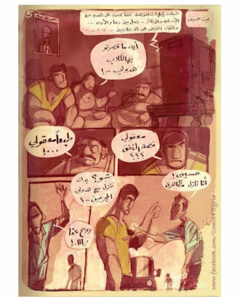 La storia “Condoglianze”, mostrata di seguito, presenta un figlio unico, Haidar, che proviene da un villaggio povero. Il dialetto dei fumetti indica che proviene da una famiglia alawita della costa siriana. Haidar decide di arruolarsi nell’esercito perché non vuole che i suoi genitori soffrano la fame e per difendere il suo villaggio dai militanti. Il padre critica questa scelta. Quando Haidar viene ucciso in guerra, i rappresentanti ufficiali del regime vengono a casa dei suoi genitori e li costringono a rilasciare un’intervista televisiva sulla perdita di un figlio martirizzato. Nella foga del momento, il padre di Haidar non è in grado di dire nulla di coerente, e invece piange per il figlio morto.