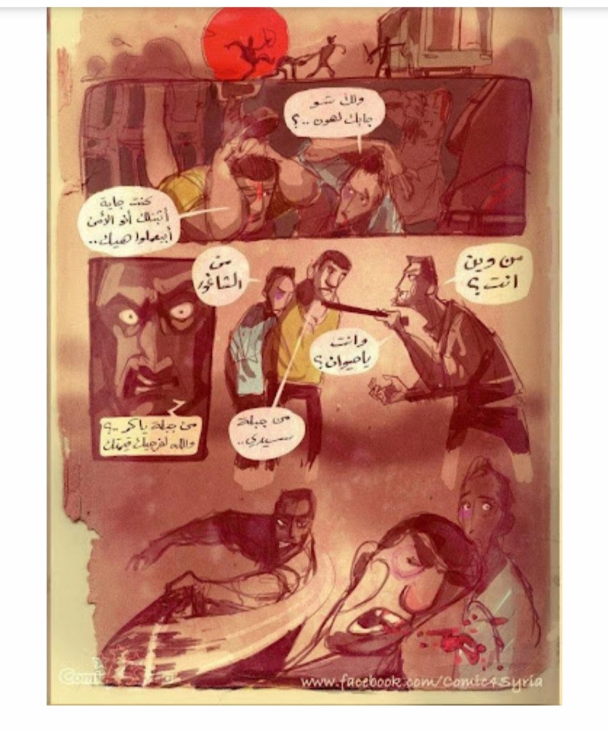 Con lo stesso impulso che ha spinto Ferzat e altri, Comic4 Syria ha lavorato per contrastare l’eredità del regime e per recuperare il controllo della realtà. Mentre affrontavano la censura in Siria, il loro uso su Facebook serviva a “divulgare il proibito”, secondo le parole del fumettista libanese Georges Khoury. Khoury ha fondato il primo collettivo di fumetti nella regione a metà degli anni ’80. Lo scrittore ed editore Malu Halasa spiega in Syria Speaks:
