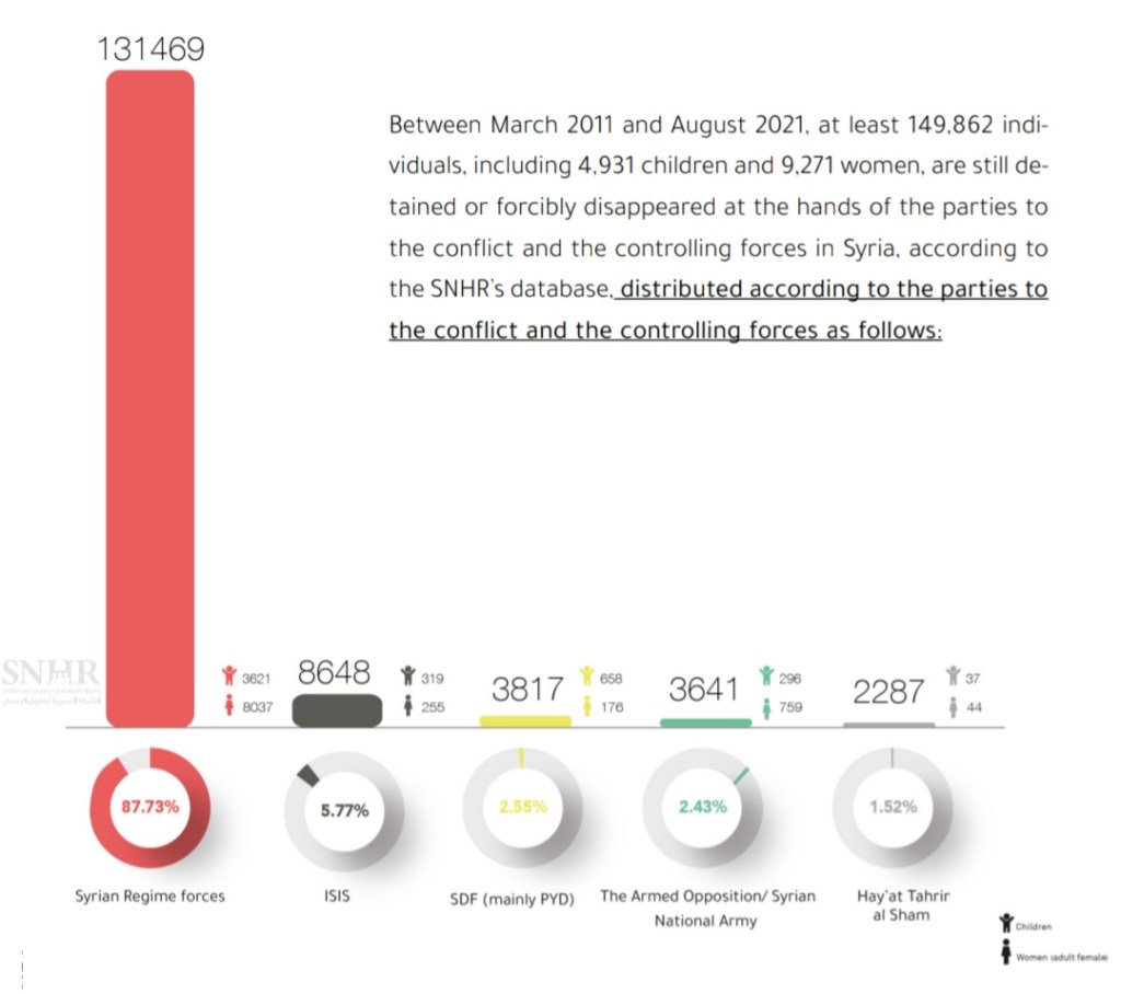 Da marzo 2011 ad agosto 2021, come rileva il rapporto, almeno 149.862 persone, tra cui 4.931 bambini e 9.271 donne, sono ancora arrestate/detenute o vittime di sparizioni forzate per mano delle parti in conflitto e delle forze che controllano la Siria. Di queste, 131.469 persone, tra cui 3.621 bambini e 8.037 donne, sono ancora detenute o vittime di sparizione forzata per mano del regime siriano, mentre altre 8.648 persone, tra cui 319 bambini e 225 donne, sono ancora scomparse, rapite dall’ISIS, e 2.287 altre persone, di cui 37 bambini e 44 donne, sono ancora detenute o fatte sparire con la forza da Hay’at Tahrir al Sham.