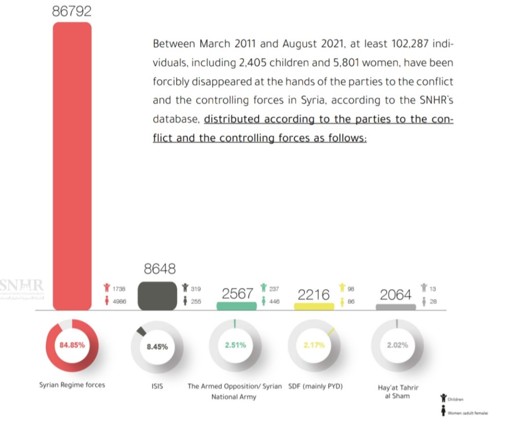 Come rivela il rapporto, almeno 102.287 individui, tra cui 2.405 bambini e 5.801 donne, risultano ancora scomparse tra marzo 2011 e agosto 2021 per mano delle parti in conflitto e delle forze di controllo in Siria, con 86.792 di questo totale scomparsi per mano delle forze del regime siriano, tra questi 1.738 bambini e 4.986 donne, e altre 8.648 persone, tra cui 319 bambini e 225 donne, sono scomparse a causa dell’ISIS. Nel frattempo HTS è stata responsabile della scomparsa di 2.064 persone, tra cui 13 bambini e 28 donne. ⬇️
