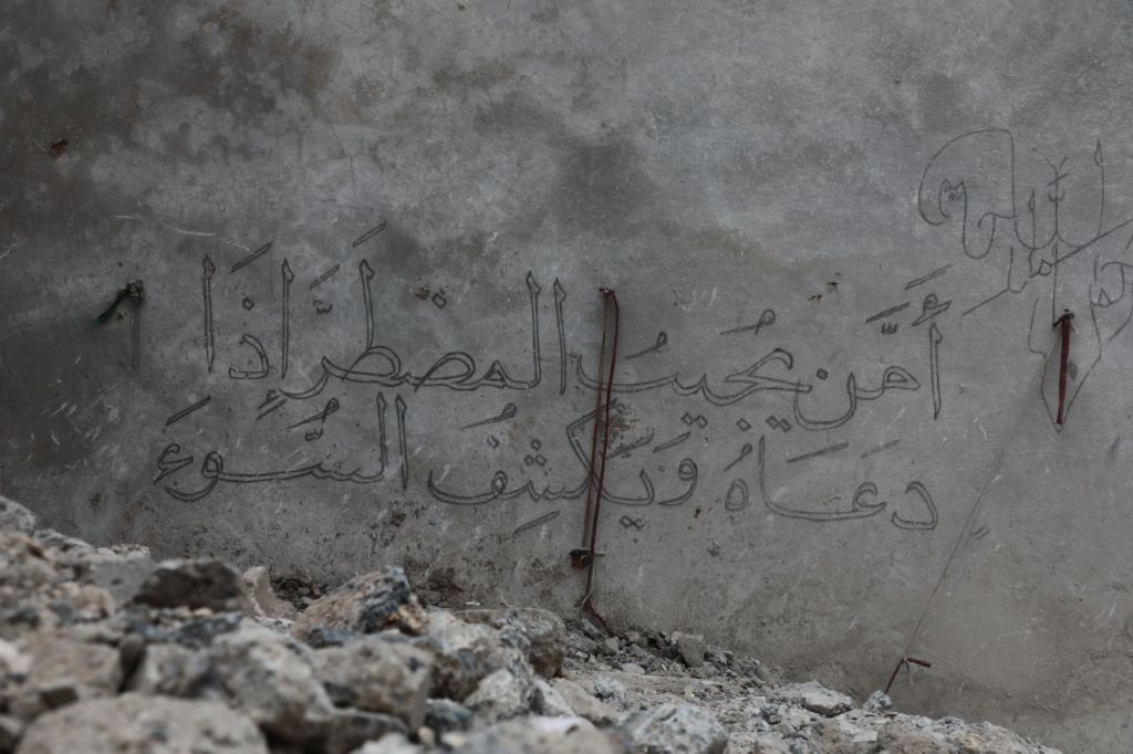 I detenuti curdi avevano ripetutamente chiesto alla guardia del loro destino. Dopo la partenza dell’ultimo combattente del partito (“combattente del partito” era il nome dato a chi combatteva nelle YPG) nell’ambito degli scambi di prigionieri, la disperazione scese sui detenuti, e su Abu Diyar. Trascorse il resto del suo tempo a disegnare sul muro dopo aver aggiustato un filo di alcuni vestiti logori che usava come righello. Dipinse il versetto coranico che recita: “Chi risponde agli afflitti quando gridano a Lui?”