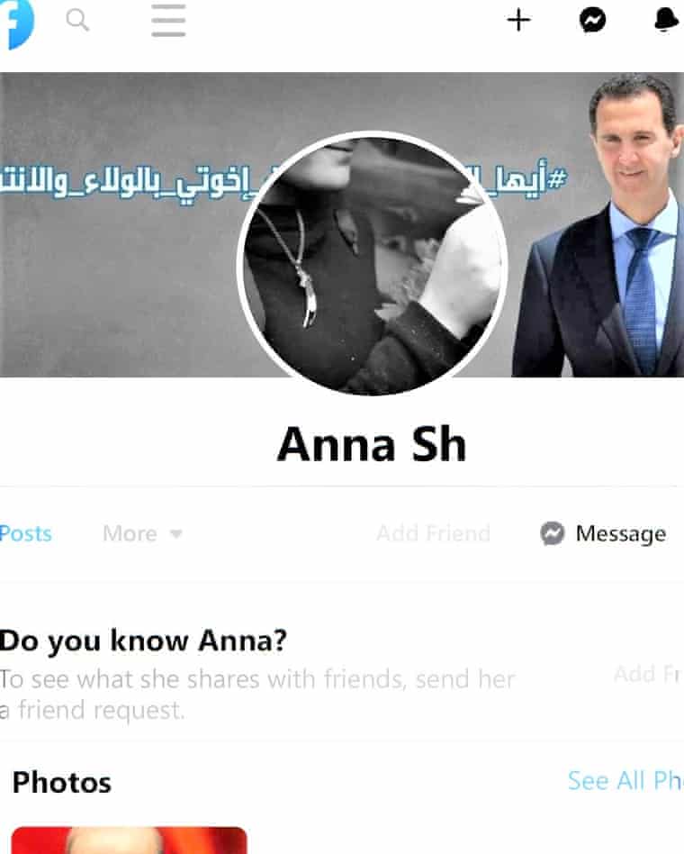Annsar nota che le spie e gli ufficiali militari siriani tendoni a usare Facebook e, nonostante le loro vite lavorative segrete, tendono a non rendere private le loro impostazioni sui social media. Ha scelto uno pseudonimo, “Anna Sh”, e ha chiesto a un amico fotografo di scattare uno scorcio seducente del suo viso. Ha quindi trasformato la sua homepage in un luminoso tributo ad Assad e alla sua famiglia e ha iniziato a cercare amici.