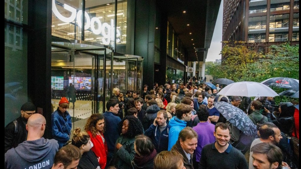 I lavoratori di Google a Londra prendono parte a uno sciopero globale contro la gestione delle molestie sessuali da parte dell’azienda nel 2018 (AFP)