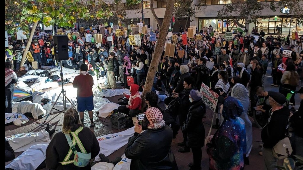 I manifestanti filo-palestinesi hanno tenuto una marcia nel dicembre 2023 fuori Google San Francisco per commemorare la morte dell’ingegnere informatico Mai Ubeid a Gaza (in dotazione)
